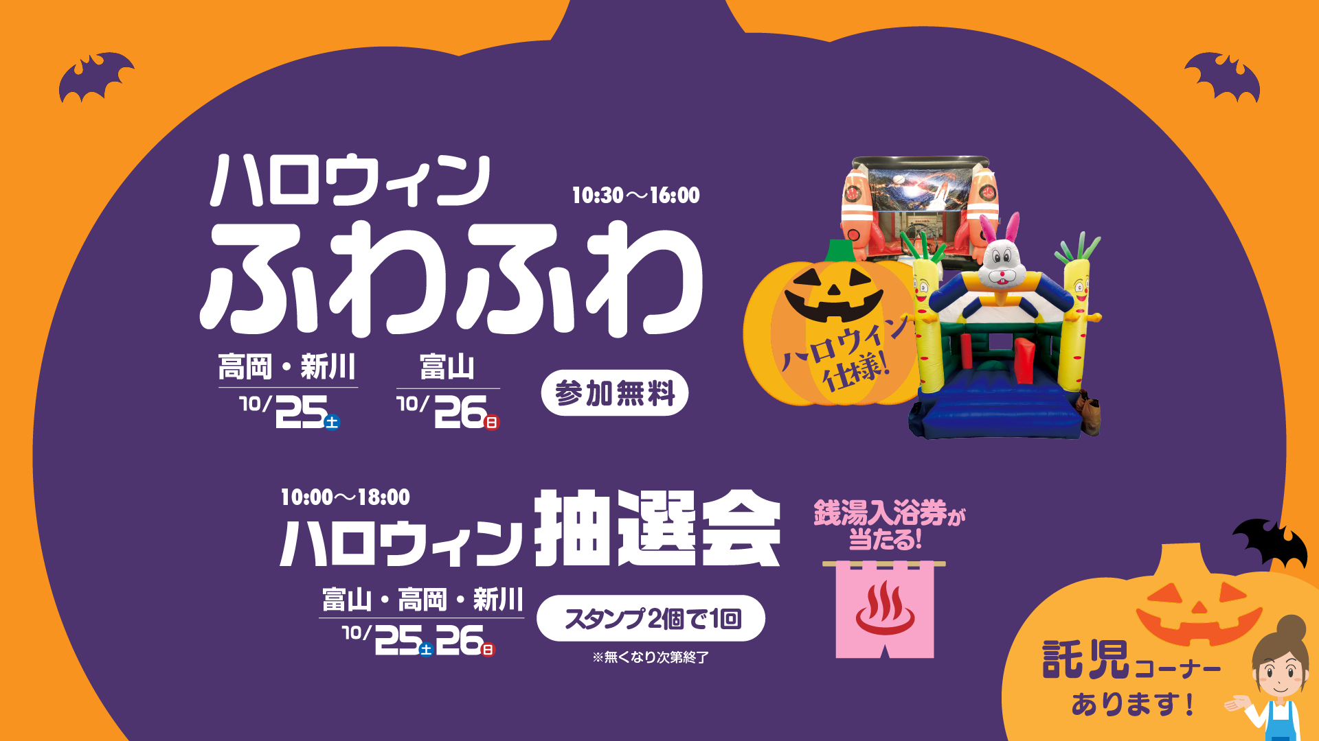 ☆ハロウィンふわふわ☆ 日程:10/25(土)…ジュートピア高岡・新川 10/26(日)…ジュートピア富山 時間:10時半~16時 ☆ハロウィン抽選会☆ ジュートピアでもらって嬉しい抽選会を開催! 時間:10時~18時 ※スタンプ2個で1回 ※賞品は変更になる可能性がございます イベント期間中、託児コーナーもあります! 小さなお子様連れでもゆっくりモデルハウスを見学できます。 ジュートピアでお待ちしています!!