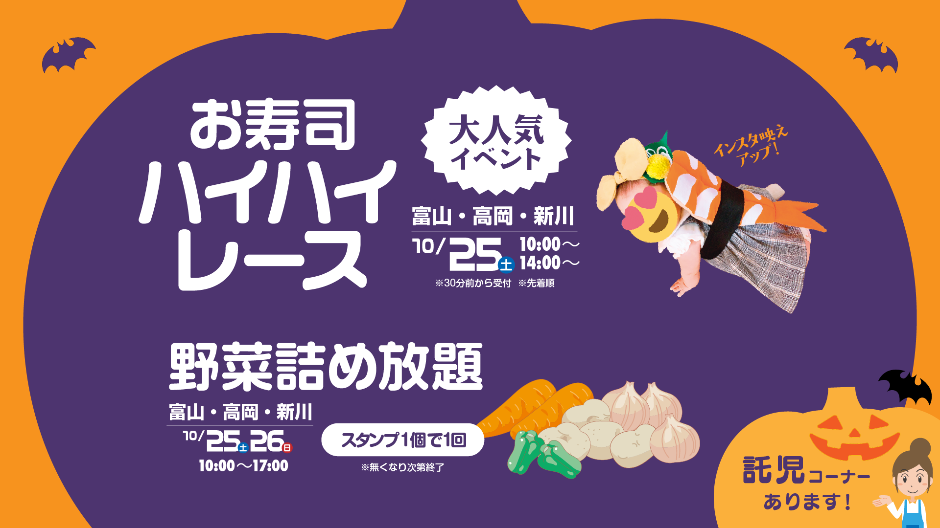 ☆大人気!お寿司ハイハイレース☆ ジュートピア3会場同時開催!! インスタ映えしちゃう?!ハイハイレース! 日時:10/25(土)1回目:10時~、2回目:14時~ ※30分前から受付、先着順 ☆野菜詰め放題!☆ 物価高に嬉しい!野菜詰め放題! 時間:10時~17時 ※スタンプ1個で1回 ※なくなり次第終了