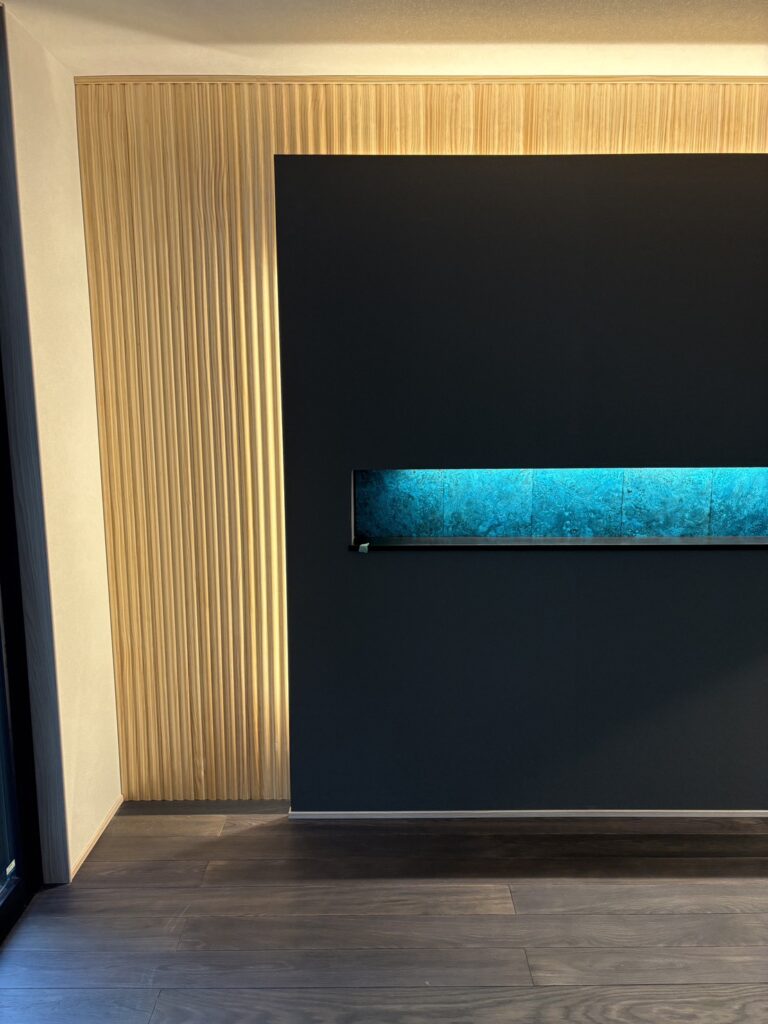 陰影が織りなす上質なアクセントウォールと、間接照明のやわらかな光。