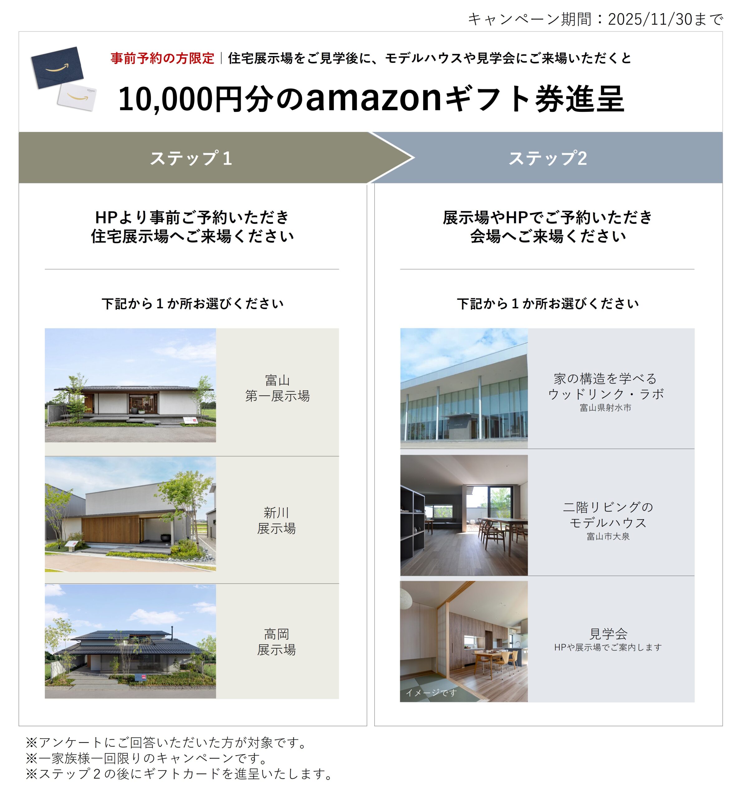 「総合住宅展示場」と「見学会などの住宅イベント」の両方にご来場いただいた方に、Amazonギフト券10,000円分をプレゼントいたします!