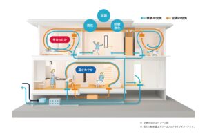 セキスイハイムの全館空調システム、【快適エアリー】は、各部屋、廊下、脱衣所など家中にあったかい空気を循環させるので、家の中はどこに居てもぽかぽかで「ヒートショック現象」の不安を軽減できます。