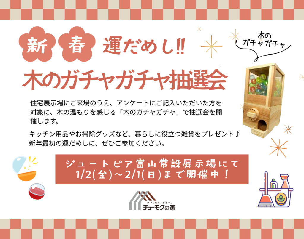 1/2(金)~2/1(日)の期間中、「チューモクの家」モデルハウスにご来場いただき、アンケートにご記入いただいた方を対象に「新春限定!!ガチャガチャ抽選会」を開催します♪ チューモクらしい“木”のガチャガチャです☺お正月のお出かけに、モデルハウスで楽しいひとときをどうぞ。
