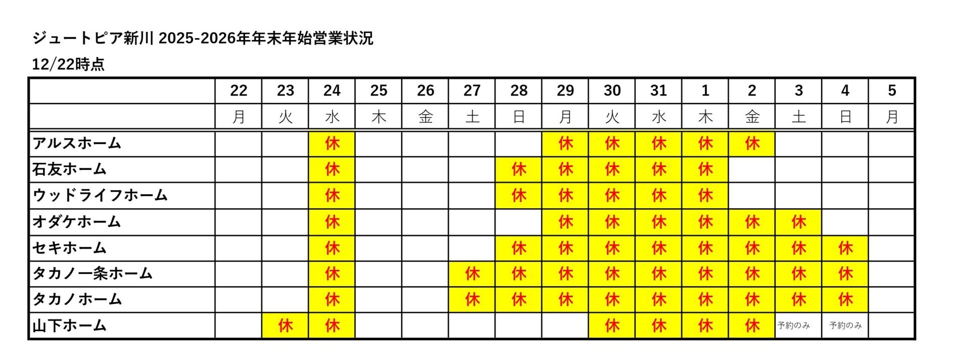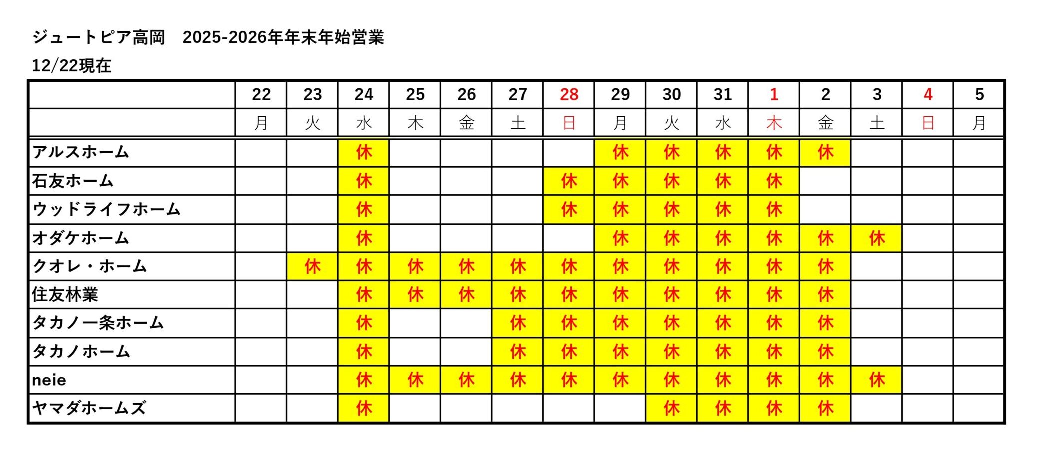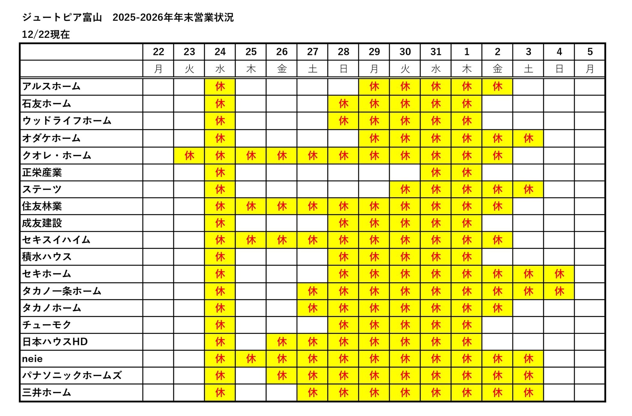 ジュートピア富山・高岡・新川の各社の年末年始休業は下記の通りです。
